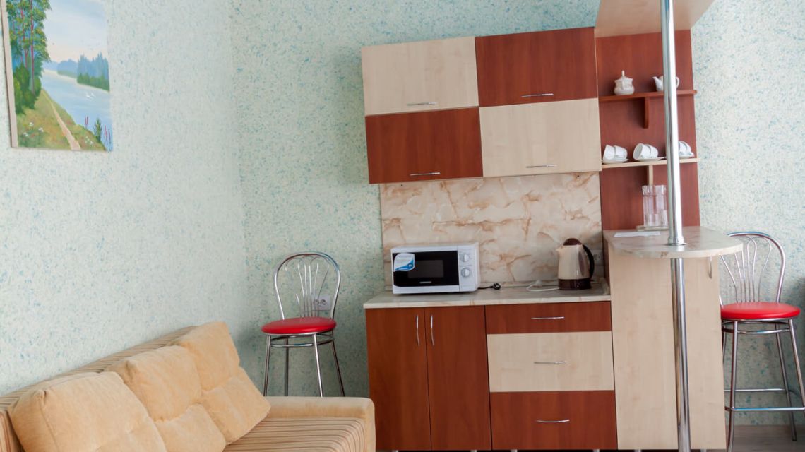 В номере: две комнаты: спальня и гостиная, двуспальная или односпальная кровать, прикроватные тумбы, стулья, стол журнальный, мягкая мебель (диван и кресла), шкаф, кухонный уголок. барная стойка, микроволновая печь, электрочайник, холодильник, телевизор, набор посуды