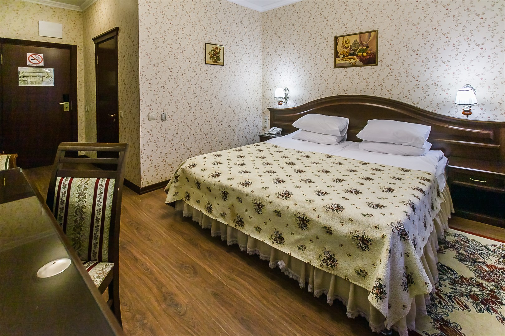 В номере: две односпальные (90*200 см.) кровати – трансформеры, сдвигаются без шва, тв цифровое, телефон, кондиционер, мини-холодильник, письменный стол, стул, зеркало, настольная лампа, бра, туалетный стол, пуф, комод-буфет, диван раскладной, кресло, гардероб с вешалками, вешалка для верхней одежды, багажница, чайник, кофе-машина