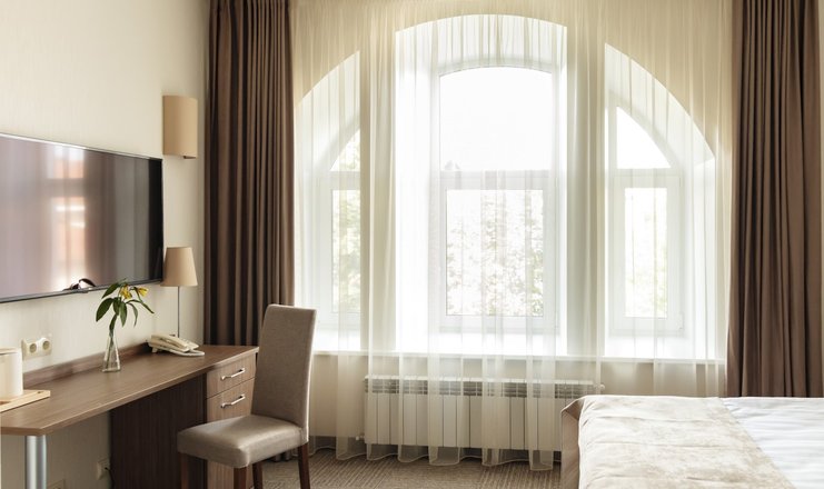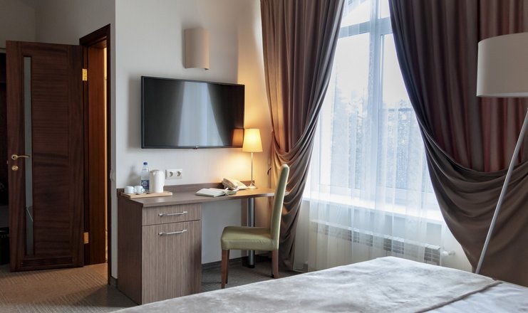 В номере: вешалка, кресло, кровать двуспальная, прикроватные тумбочки, стол, стулья, шкаф, кондиционер, телевизор ЖК, телефон, холодильник, чайный набор посуды, электрочайник
