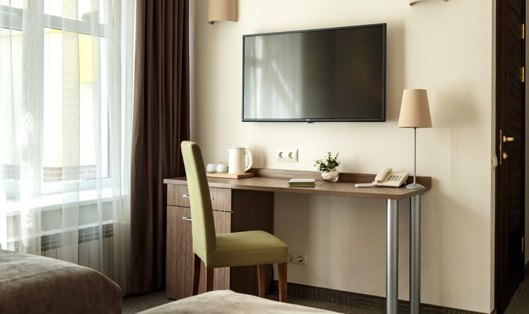 В номере: вешалка, кровати односпальные, прикроватные тумбочки, стол, стулья, шкаф, кондиционер, телевизор ЖК, телефон, холодильник, чайный набор посуды, электрочайник
