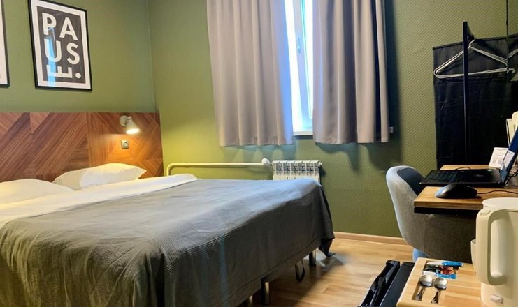 В номере: вешалка, зеркало, кровати односпальные, прикроватные тумбочки, стол, стулья, шкаф, кондиционер, мини-холодильник, телевизор, чайная станция