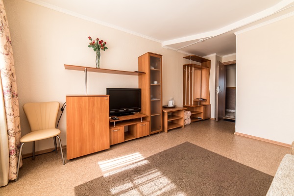 В номере: две или три односпальные кровати, прикроватные тумбы, шкаф, журнальный столик, телевизор, холодильник, чайный набор посуды, электрочайник