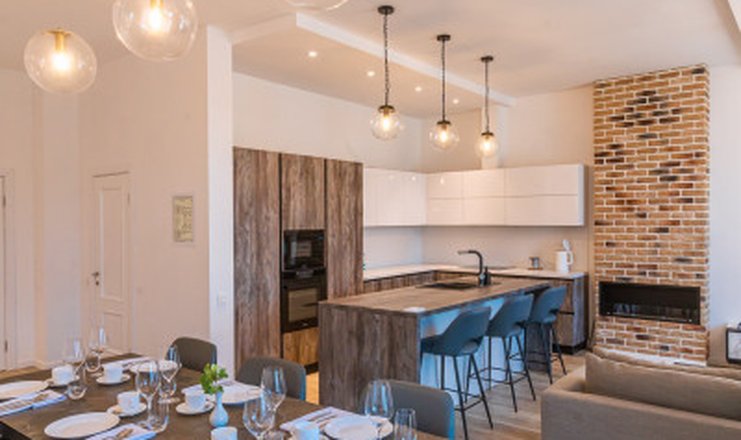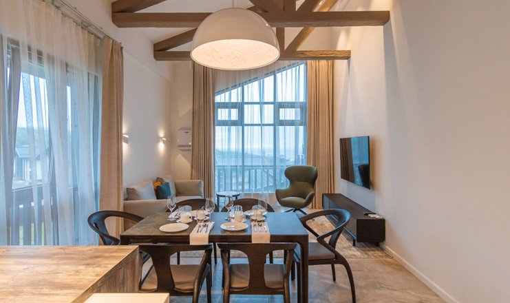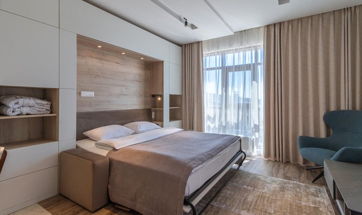 В номере: кухня, вешалка, диван, зеркало, кровать двуспальная, стол, стулья, шкаф, гладильная доска, кондиционер, микроволновая печь, набор посуды, посудомоечная машина, стиральная машина, телевизор, утюг, холодильник, чайный набор посуды, электрическая плита, электрочайник