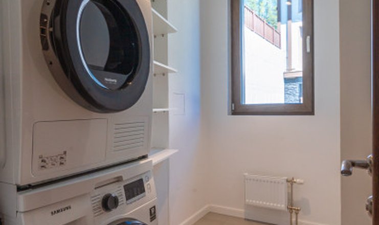 В номере: кухня, вешалка, диван, зеркало, кровать двуспальная, прикроватные тумбочки, стол, стулья, шкаф, гладильная доска, камин, кондиционер, микроволновая печь, набор посуды, посудомоечная машина, стиральная машина, утюг, холодильник, чайный набор посуды, электрическая плита, электрочайник